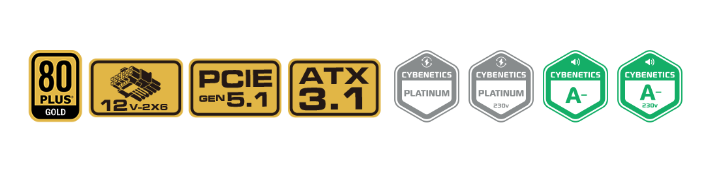 Conçue pour les systèmes nouvelle génération, la série COUGAR GLE est conforme à la norme ATX 3.1. Dotée d'une conception native 12 V-2X6, elle alimente les cartes graphiques nouvelle génération via un seul câble 12+4 broches. Avec sa certification 80 PLUS Gold et sa certification Cybenetics Platinum (1000 W seulement), elle offre stabilité, durabilité et fiabilité de haut niveau.