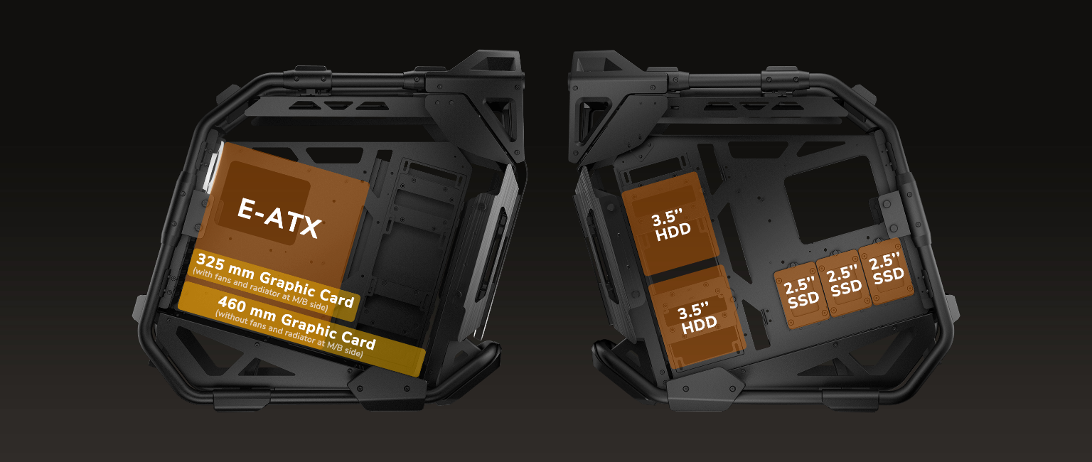 Avec un excellent support pour une carte mère E-ATX, des cartes graphiques de 460 mm, deux disques durs de 3,5 pouces et trois SSD de 2,5 pouces, le puissant Cratus peut héberger même les configurations de système les plus extrêmes.