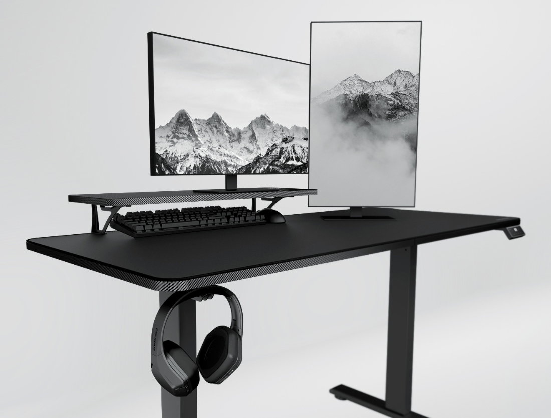 La verticalité du support de moniteur indépendant optimise l'espace fonctionnel tandis qu'un plateau de gestion des câbles et un support de casque libèrent le bureau de l'encombrement, maximisant ainsi la surface utilisable.