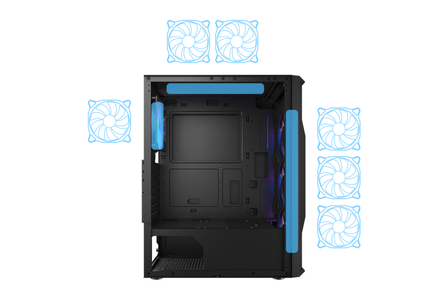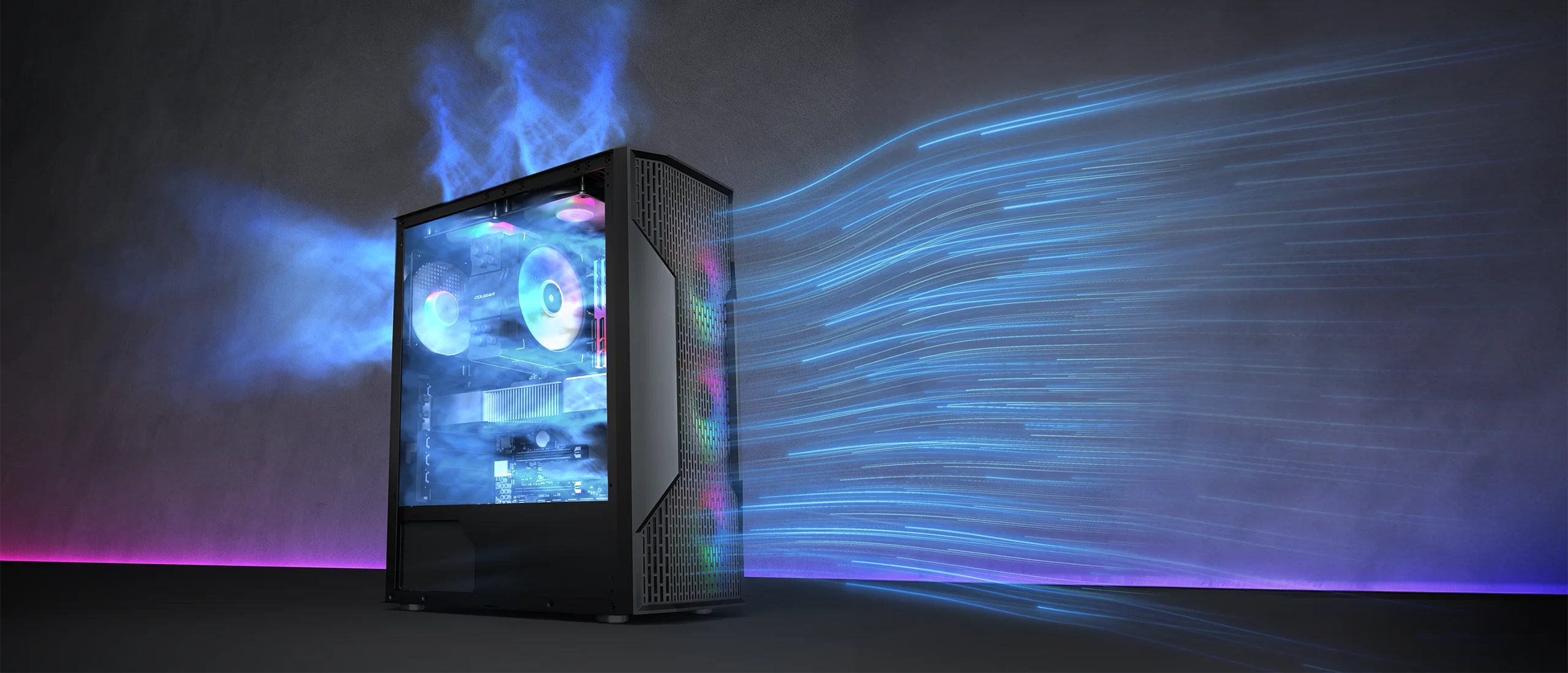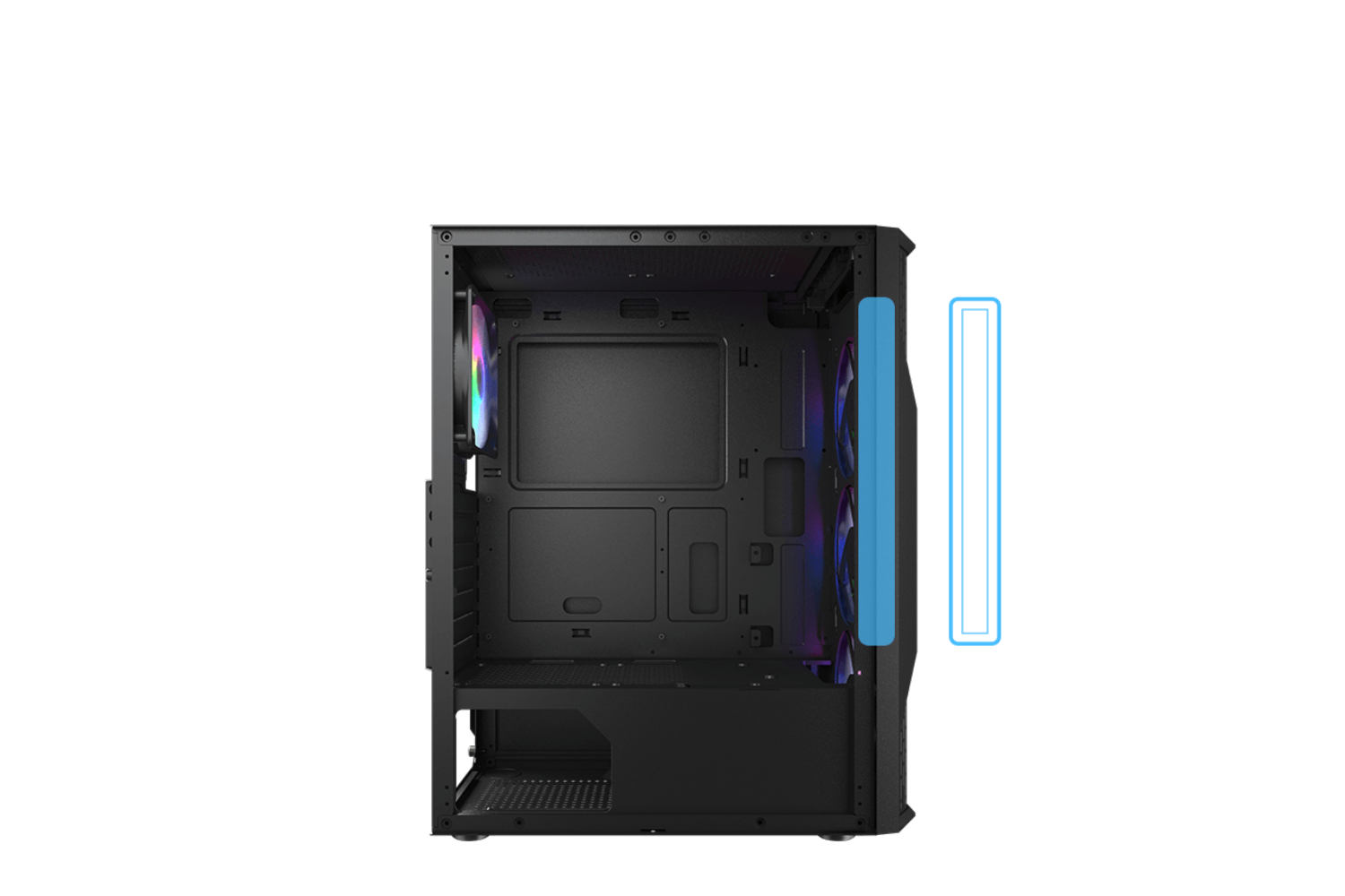 Trois ventilateurs RGB fixes de 120 mm préinstallés à l'avant et un ventilateur RGB supplémentaire de 120 mm à l'arrière refroidissent votre système dès sa sortie de l'emballage avec une touche d'élégance. Ce système peut accueillir jusqu'à 6 ventilateurs de 120 mm. La prise en charge d'un radiateur tout-en-un de 240 mm ou d'un refroidisseur à air de 158 mm de hauteur garantit une température optimale de votre système, même en cas de forte chaleur.