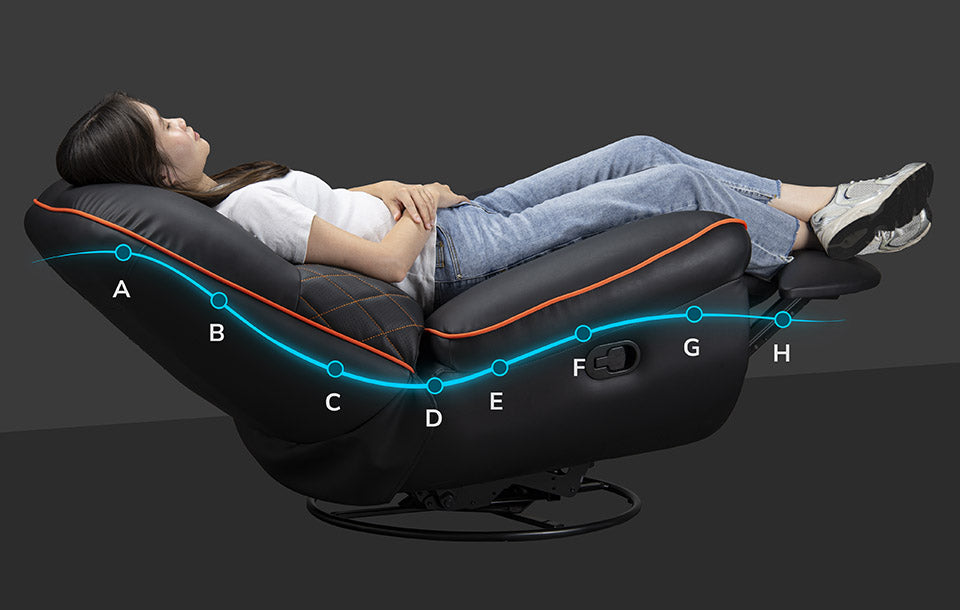 F. Cuisses : L'angle d'inclinaison réglable améliore le confort des jambes et favorise la circulation.