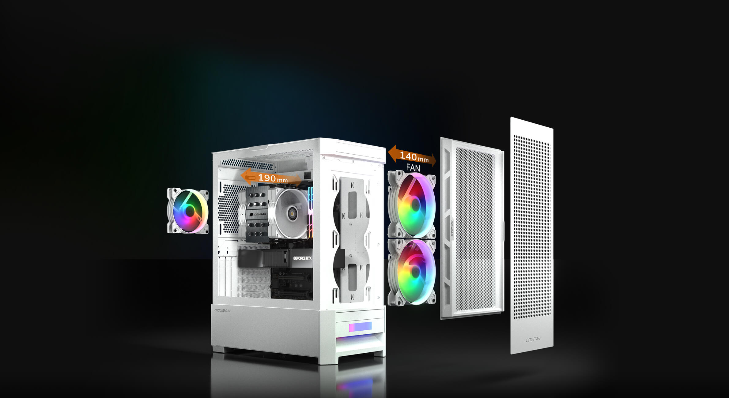 L'espace intérieur du Duoface RGB peut accueillir jusqu'à cinq ventilateurs, un radiateur de refroidissement à eau de 280 mm et un refroidisseur de processeur de 190 mm de hauteur. Cet immense potentiel de refroidissement évite la surchauffe de vos composants critiques.