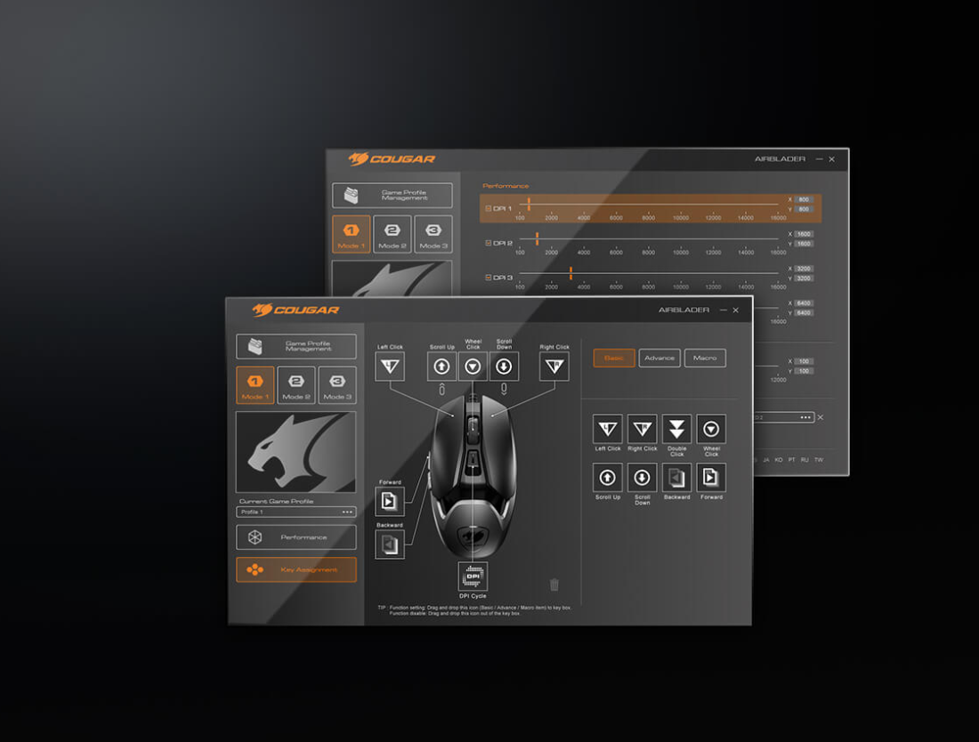 Avec une interface pratique et intuitive, COUGAR UIX permet aux joueurs de créer facilement la fonction personnalisée de toutes les touches, il peut également créer des paramètres de macros en même temps. De plus, en commutant 3 modes différents et en coopérant avec 6 boutons configurables d'AIRBLADER, il permet de réaliser diverses combinaisons et offre aux joueurs plus de possibilités de définir eux-mêmes des fonctions spéciales.