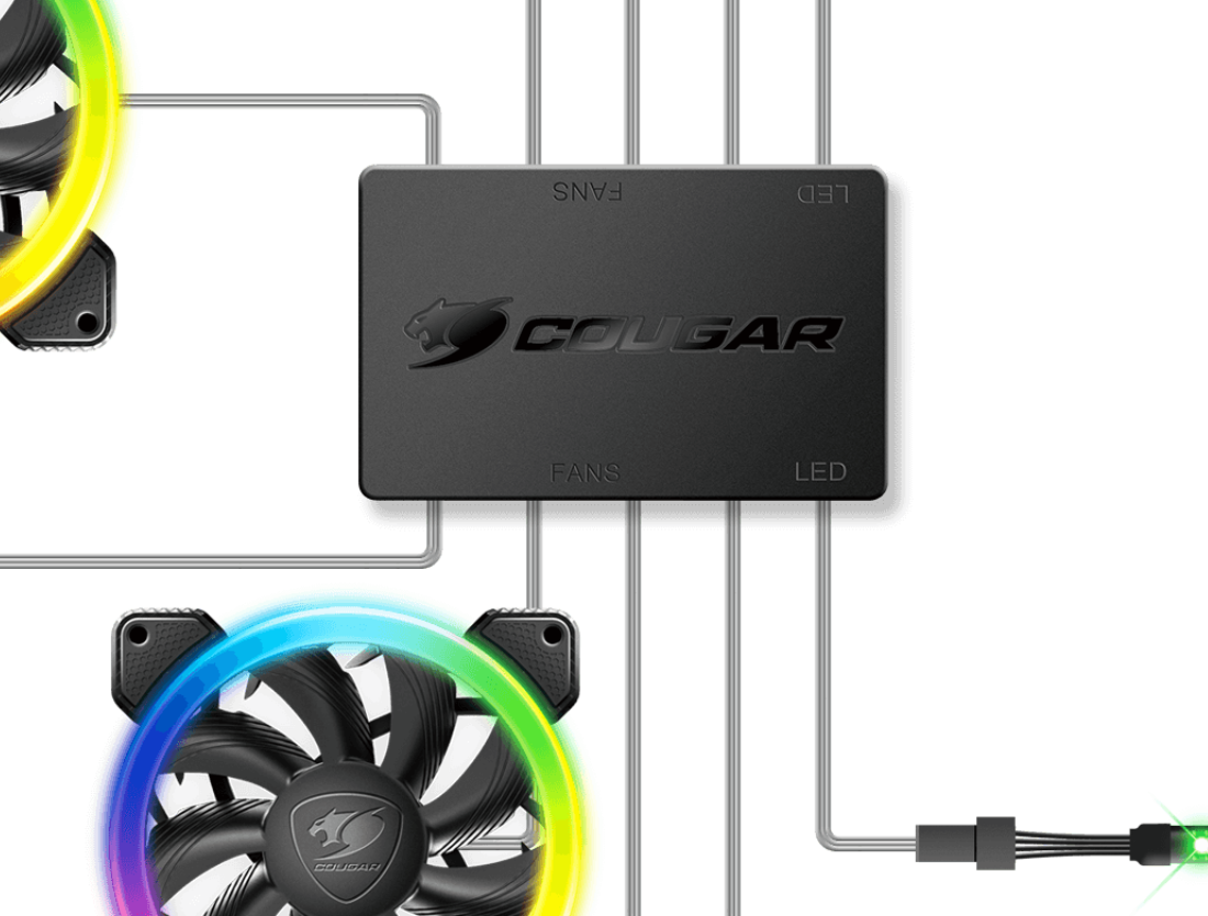 Le boîtier COUGAR Core Box C inclus, qui prend en charge jusqu'à 8 ventilateurs et 4 bandes LED RGB, vous permet de contrôler directement ses 14 effets d'éclairage prédéfinis avec un interrupteur inclus ou avec le bouton de réinitialisation de votre boîtier. Vous pouvez également le connecter à l'en-tête RGB 5 V à 3 broches des cartes mères compatibles pour une synchronisation à l'échelle du système !