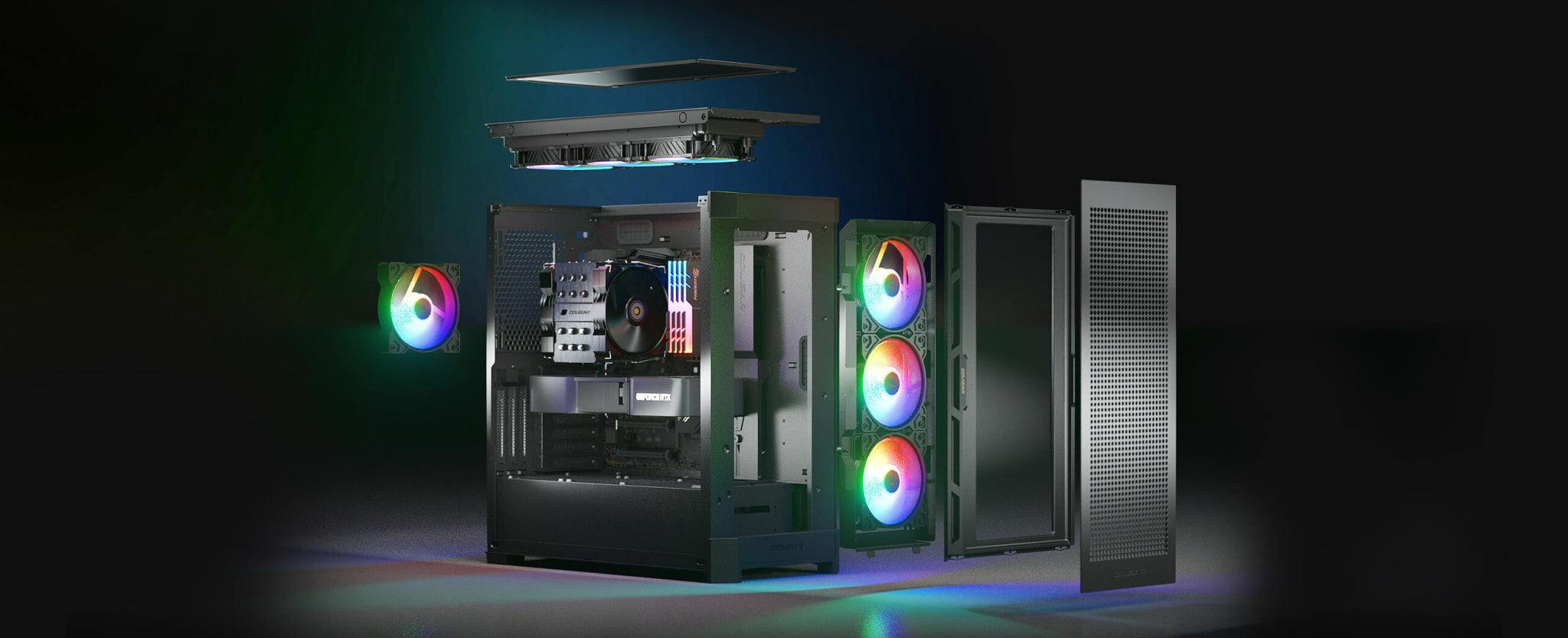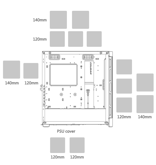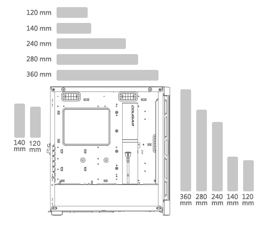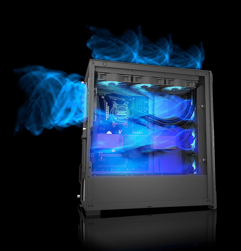 Avec la prise en charge de neuf ventilateurs maximum, d'un radiateur de refroidissement par eau de 360 mm et d'un refroidisseur de processeur jusqu'à 190 mm de hauteur, le potentiel de refroidissement impressionnant du Duoface Pro RGB élimine complètement tout risque de surchauffe de vos composants critiques.