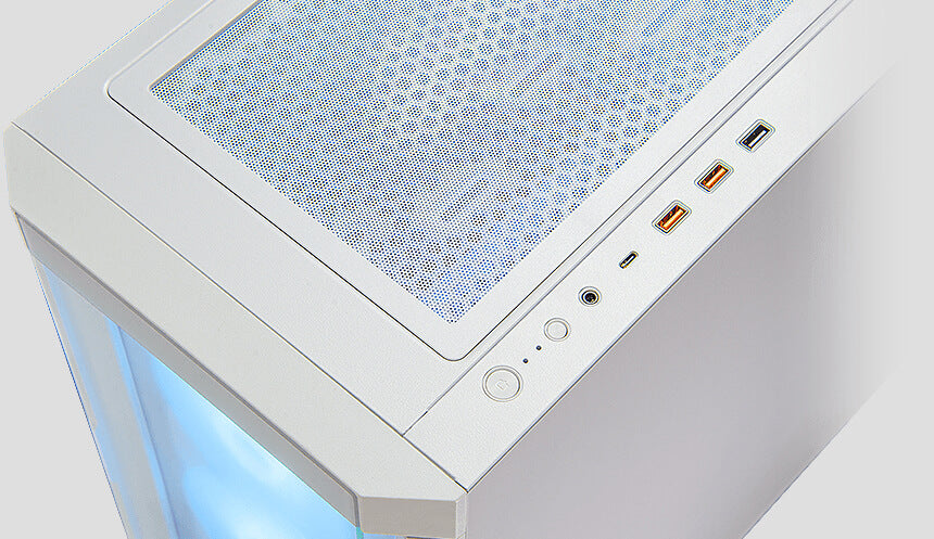 Comprend un connecteur Type-C Gen 2 (Key-A 20 broches), 2 ports USB 3.0, un port USB 2.0, une prise combinée audio/microphone, un bouton RVB et un bouton d'alimentation.